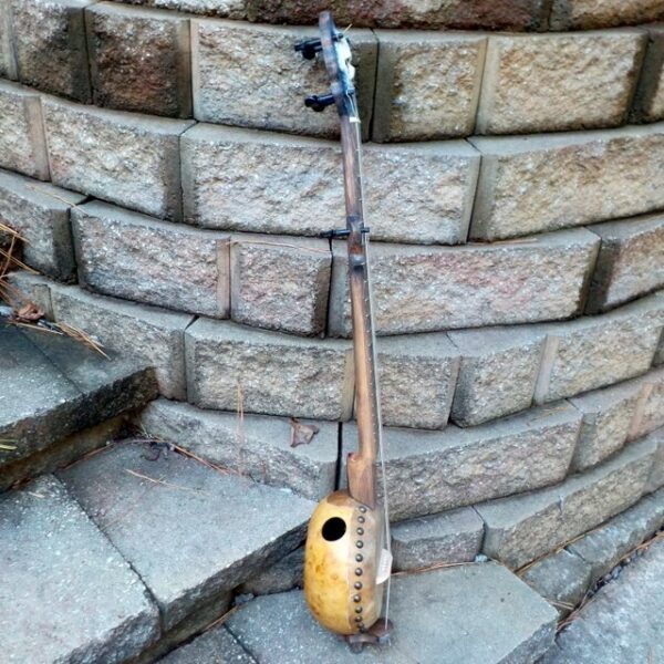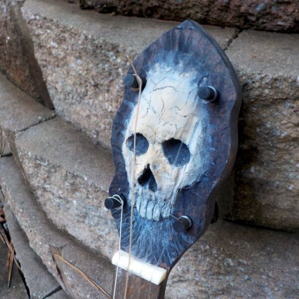 A hauntingly beautiful instrument, the Skull Creek fretted gourd banjo captures the spirit of raw craftsmanship and mystery. Its peghead features a hand-carved skull emerging from the wood itself, giving the impression of something ancient awakening from the earth. The nut is crafted from real bone, adding both authenticity and eerie character. With its rustic finish and bright, balanced tone, this banjo feels like it was unearthed from a forgotten cabin along a dark creek. A striking blend of folk art and musical soul — mysterious, primal, and full of life from another time.