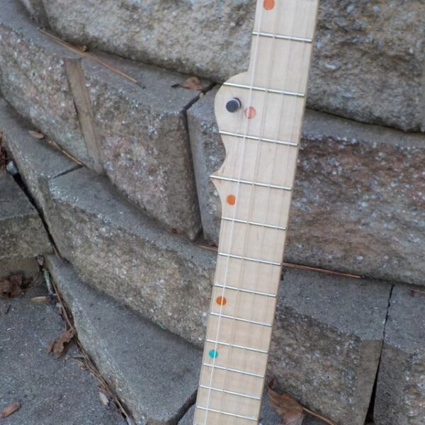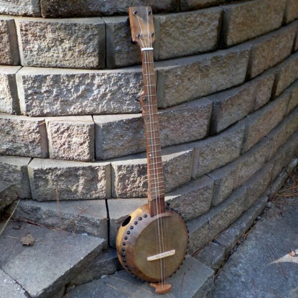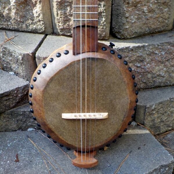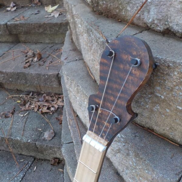 Banjo #541 features a beautifully natural, untouched gourd body that shows off its organic texture and shape. The neck, fretboard, and peghead are crafted from premium Curly Maple, all finished in a warm deep red brown that highlights the woods dramatic figure.